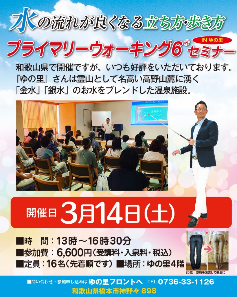 皆様に3月14日(土曜日)開催の和歌山での『プライマリーウォーキング6®︎セミナー』のご案内です。
